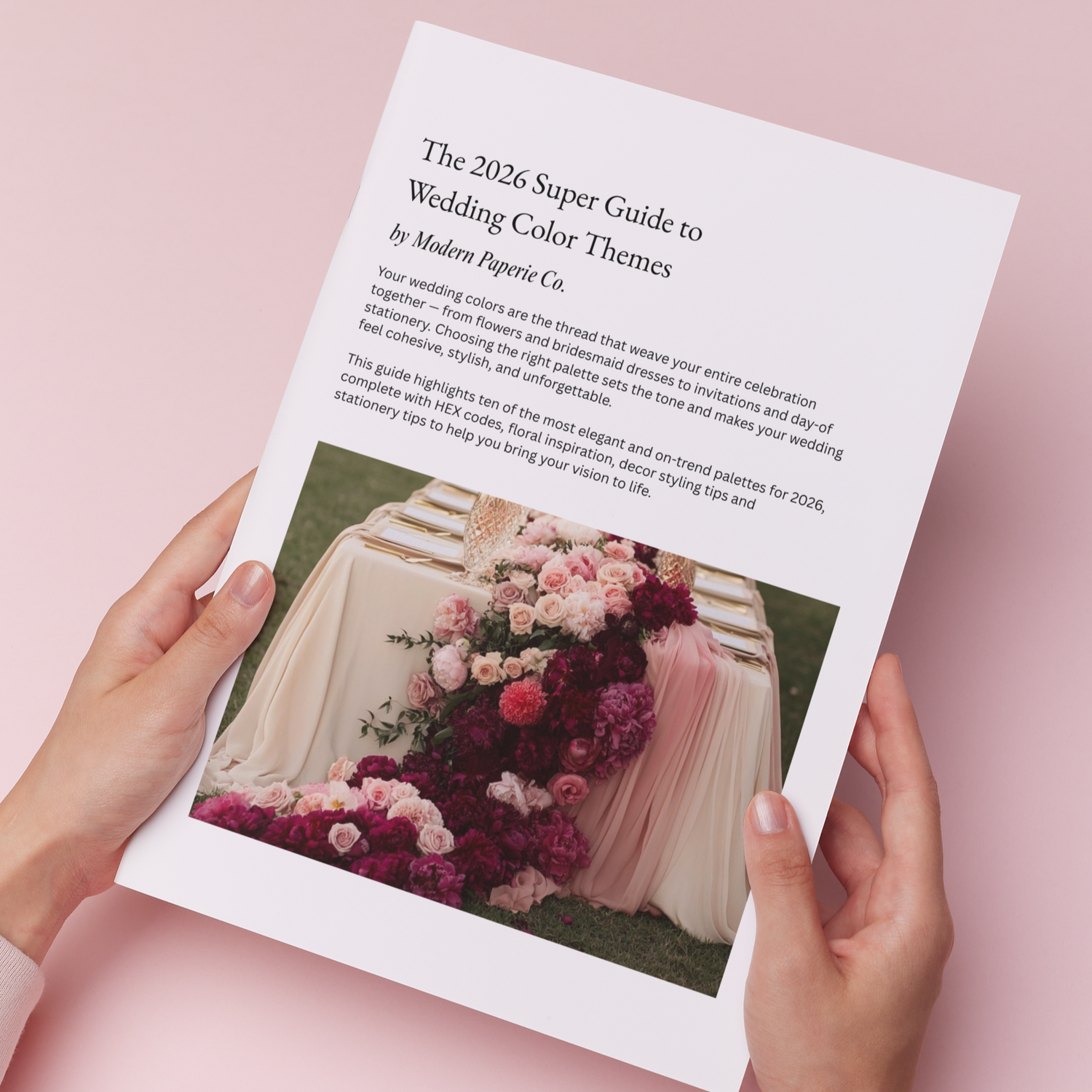 Choosing the right wedding colors can transform your entire celebration, from your invitations to your flowers and décor. Our free 2026 Wedding Color Super Guide reveals the top palettes, complete with HEX codes, floral pairings, and styling tips you won’t find anywhere else. Whether you’re dreaming of romantic berry tones, bold cobalt elegance, or soft coastal pastels, this guide gives you everything you need to design a cohesive and unforgettable wedding. Don’t miss out—download it today and start planning your perfect palette.