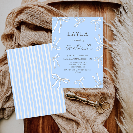 Elegant Blue Bow 12th Any Age Birthday Invitation