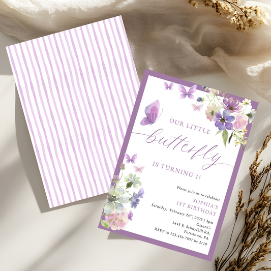 Watercolor Floral Purple Butterfly Birthday Invitation