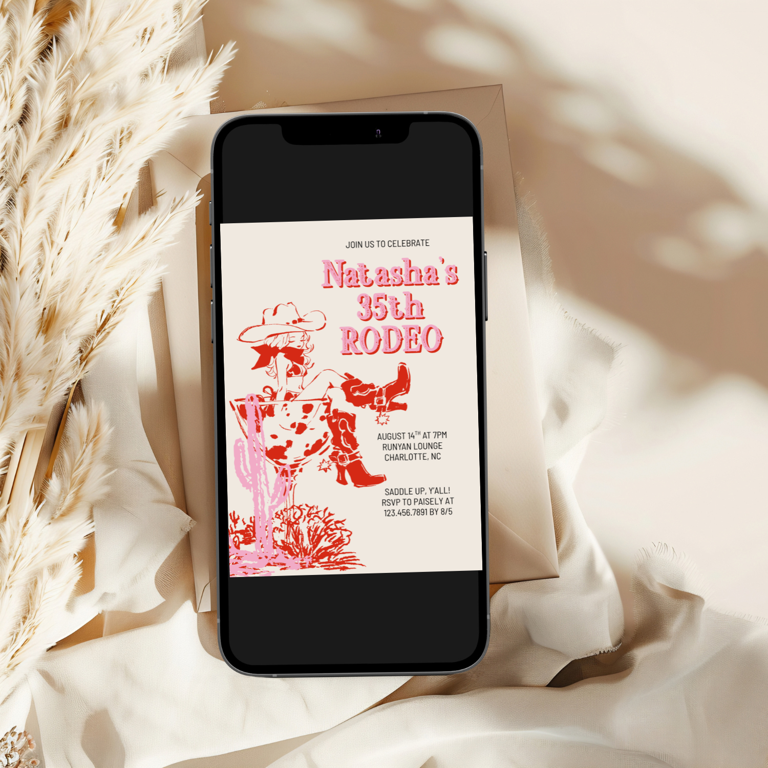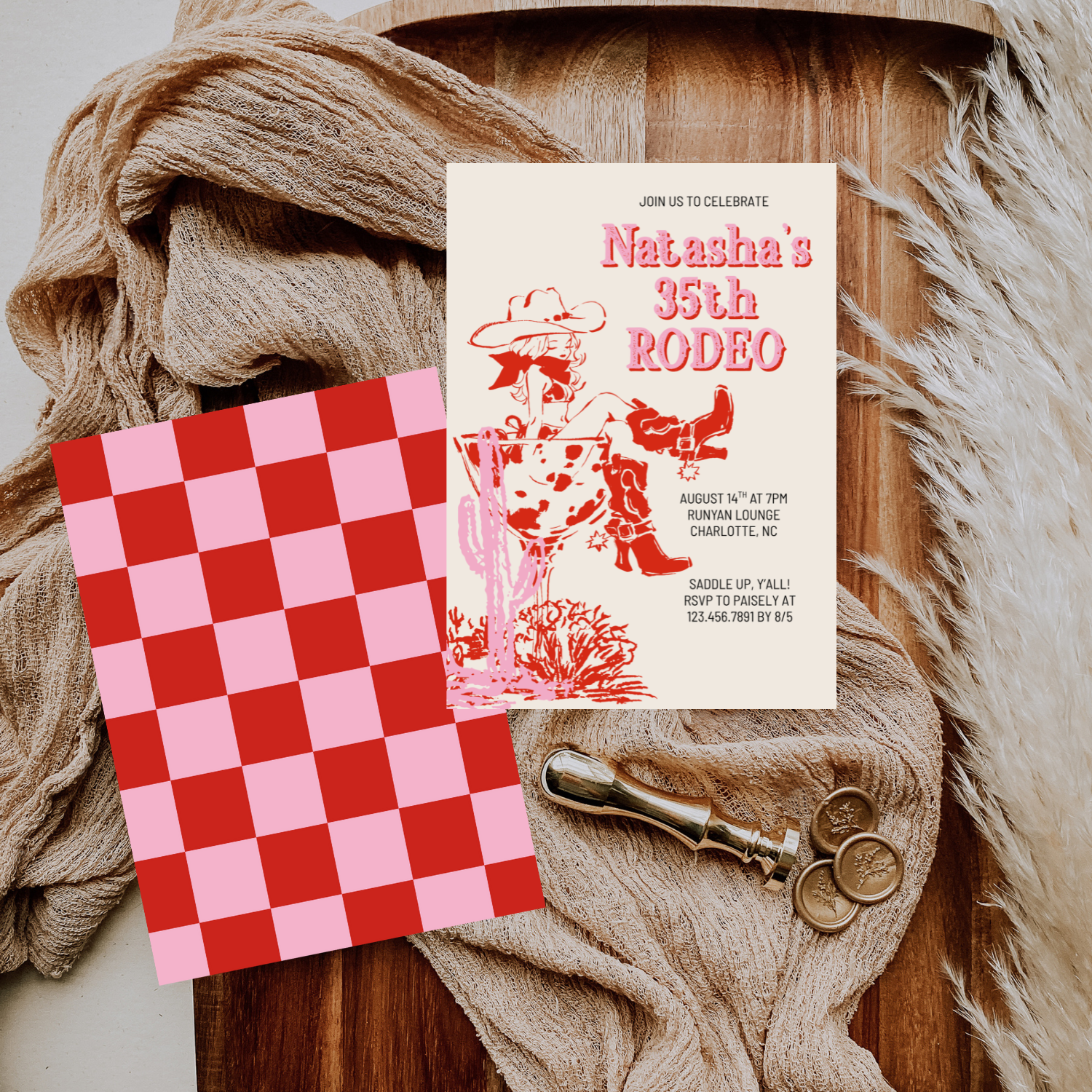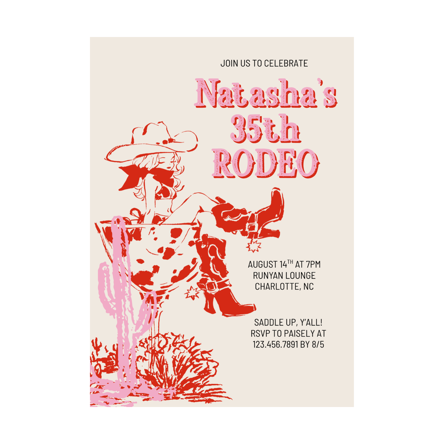Saddle up in style with this chic cowgirl martini invitation — the perfect blend of western glam and retro fun. Featuring a playful illustration of a cowgirl lounging in a martini glass, this pink and red invitation is ideal for birthdays, bachelorette weekends, or girls’ night celebrations. Easy to edit and download, it’s a fun and feminine way to set the tone for a night your guests won’t forget.