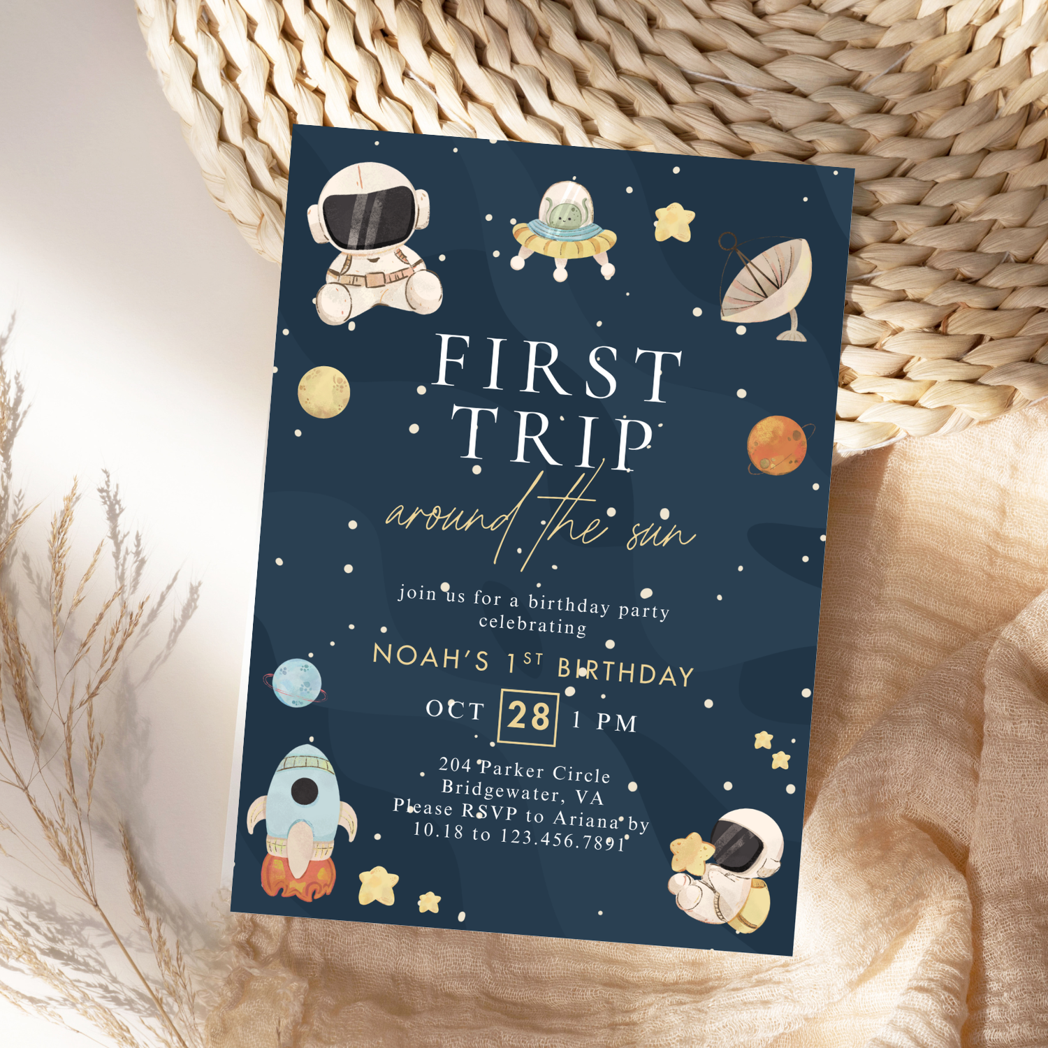 Celebrate your little one’s first birthday with this charming “First Trip around the sun” birthday invitation! Featuring adorable space-themed illustrations including astronauts, planets, rockets, and stars, this printable invite is perfect for a first birthday party with a cosmic twist. Designed for easy customization and instant download, this digital invitation makes party planning effortless and fun. If you are hosting a space-themed birthday bash or looking for a cute and unique 1st birthday invite, this design adds the perfect personal touch to your celebration.