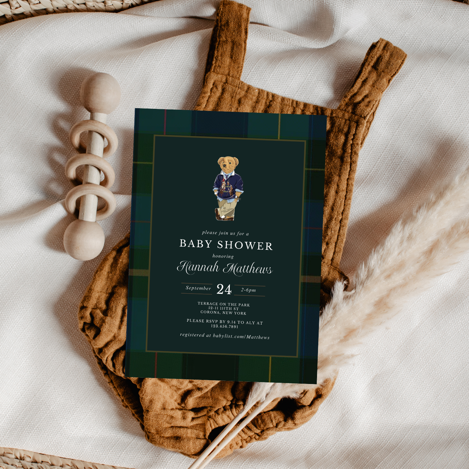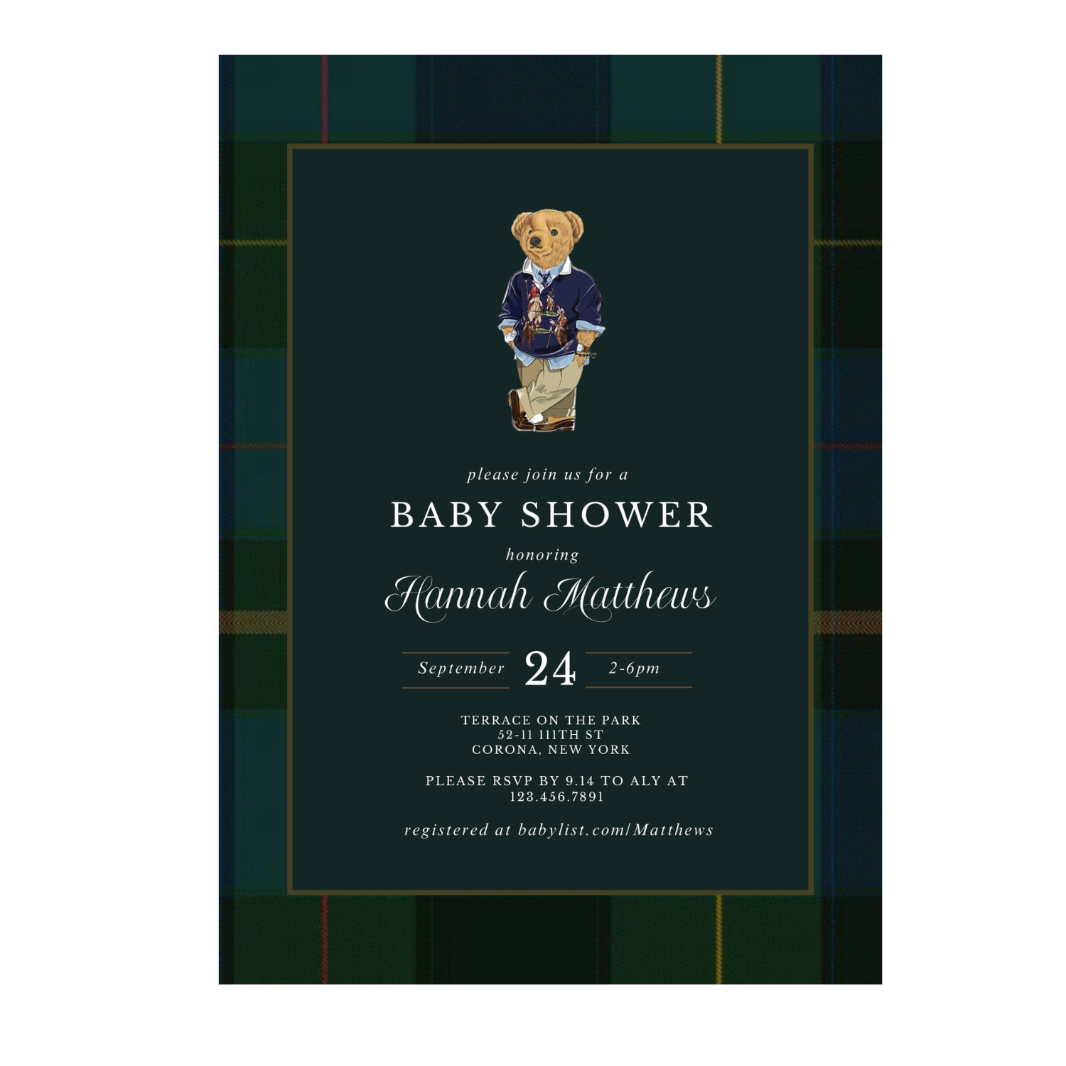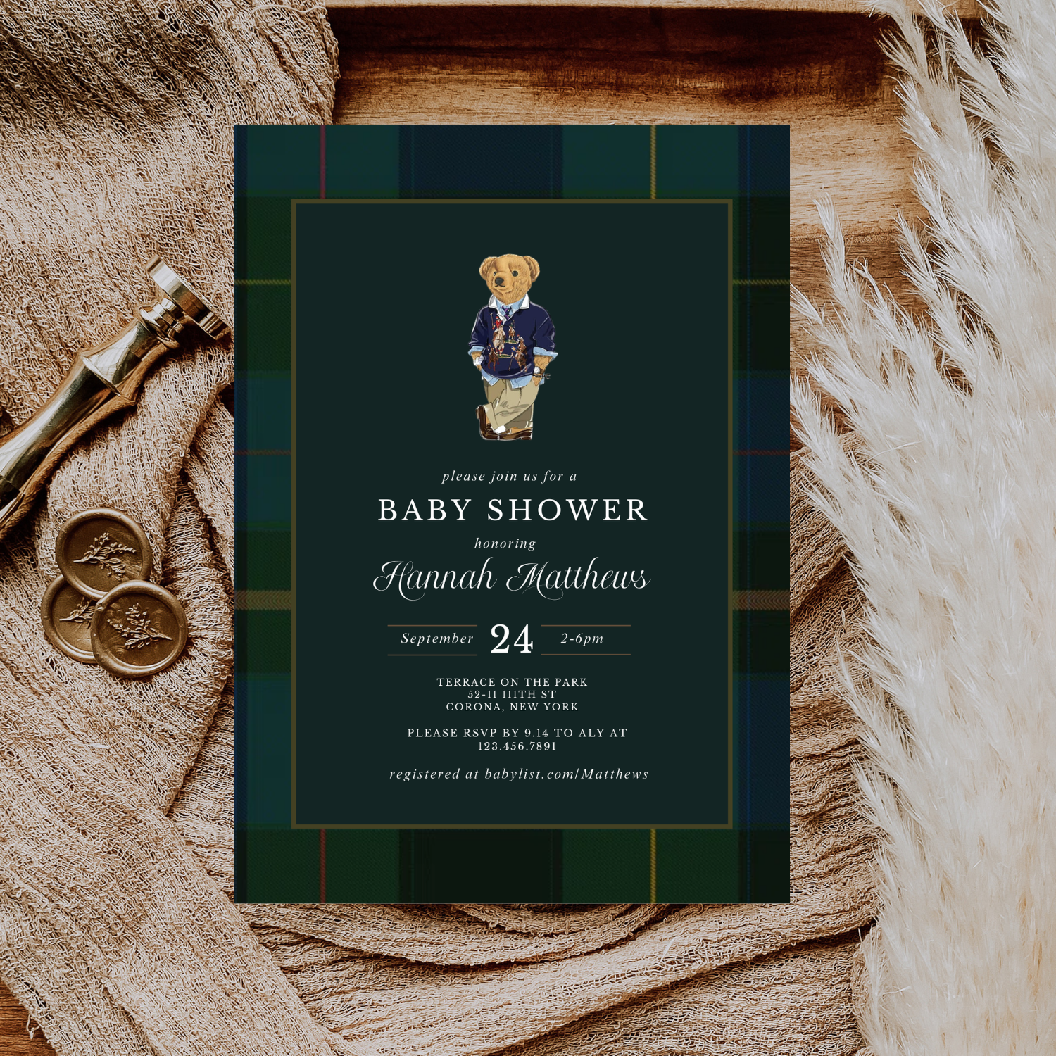 Celebrate the upcoming arrival of a little one with this classic and sophisticated baby shower invitation. Featuring a navy and green tartan plaid background with an adorable preppy teddy bear illustration, this invitation is perfect for an elegant and timeless baby shower. The gold accents and refined typography add a touch of luxury, making it ideal for those who love a classic, Ralph Lauren-inspired aesthetic.