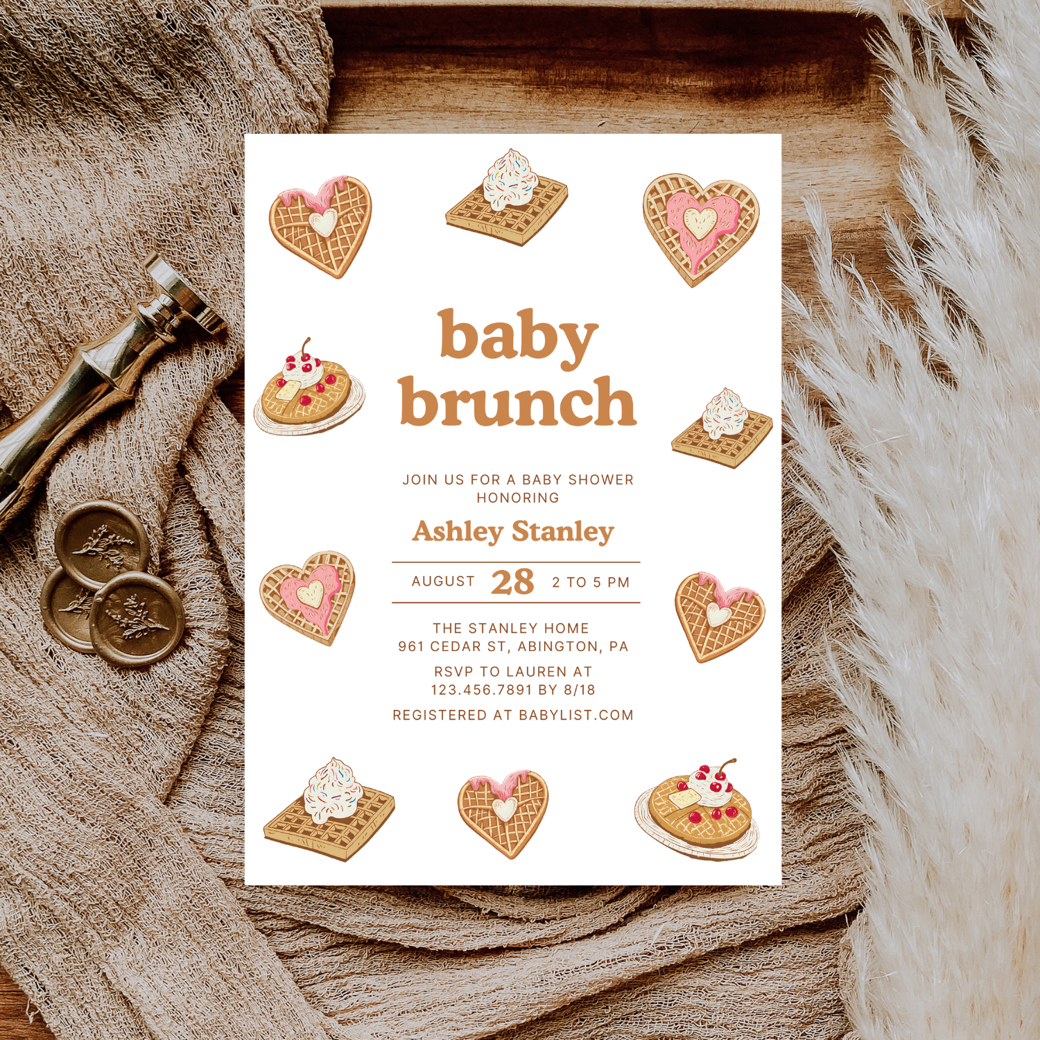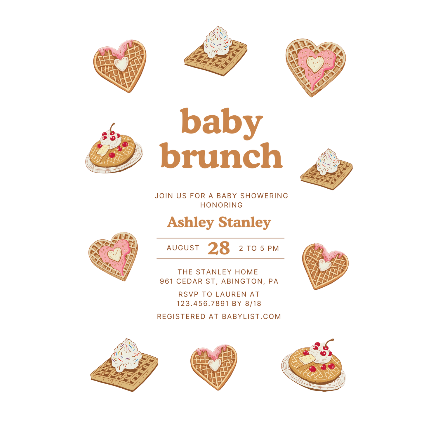 Celebrate in style with our Baby Shower Brunch Invitation, featuring a charming waffle theme that’s perfect for a cozy baby brunch celebration. Designed with sweet waffle illustrations, whipped cream, and heart-shaped details, this waffles baby shower invitation brings a warm and playful touch to your event. The modern neutral color palette makes it ideal for any gender. Easily personalize your details and download instantly for printing or digital sharing. Perfect for brunch-themed baby showers, waffle parties, or modern baby brunch gatherings.