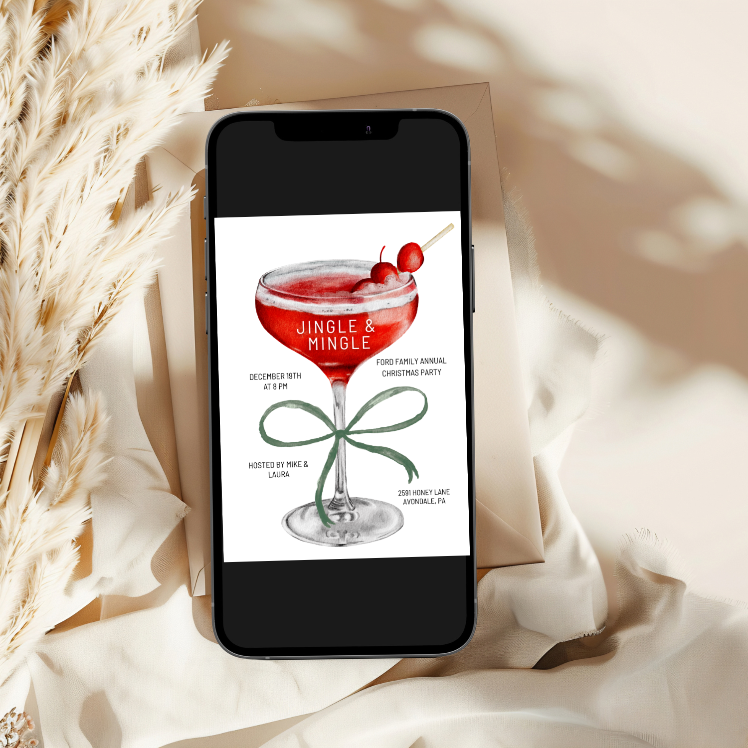 Toast the season with this Jingle and Mingle invitation — a stylish and modern holiday party design featuring a red festive cocktail and elegant script. Perfect for gatherings, cocktail hours, or winter celebrations, this editable template makes it easy to personalize, download, and share. Set the tone for a night that’s both classy and fun with this effortless digital invitation.